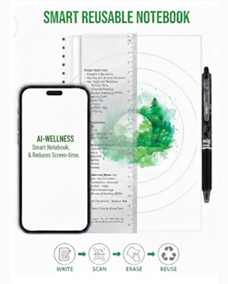 Reusable Smart NoteBook AI powered Notebook is the centerpiece of our digital wellness mission, designed for those who refuse to choose between the tactile joy of writing and the efficiency of modern technology. Award winning this lifestyle-changing tool allows you to handwrite your thoughts, sketches, and goals, then instantly digitize them using the powerful ReNAI app. It is a sophisticated solution to reduce excess screen time, allowing you to ""unplug"" during your creative process while ensuring your data remains organized and searchable in the cloud. By moving your brainstorming and planning onto paper, you reduce eye strain and improve cognitive retention, while the AI integration ensures your work is always at your fingertips. It’s more than just a notebook—it’s a smarter way to reclaim your focus in a digital world.